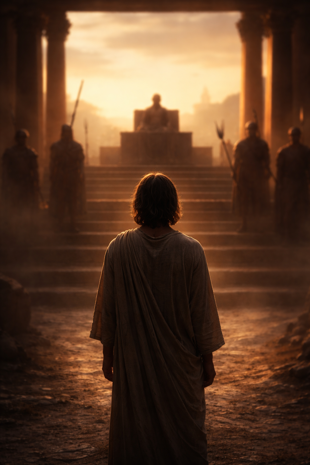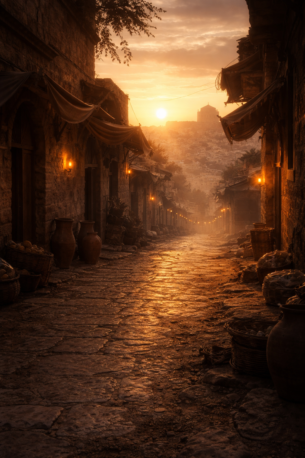 One moment, we are in the courtyard, still feeling the heat of the fire against Peter’s face. Next, we are moving through the narrow streets of Jerusalem at first light, the city just beginning to stir. Sandals on stone. Voices low, urgent. A bound man in the middle of it all.
