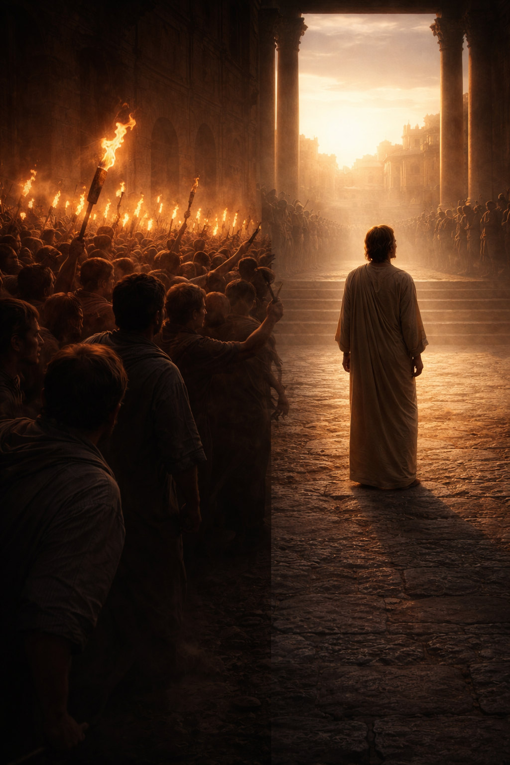 You can feel the strange tension of it. Roman authority stepping outward. Religious authority holding its ground. Neither side crossing fully into the other’s world.